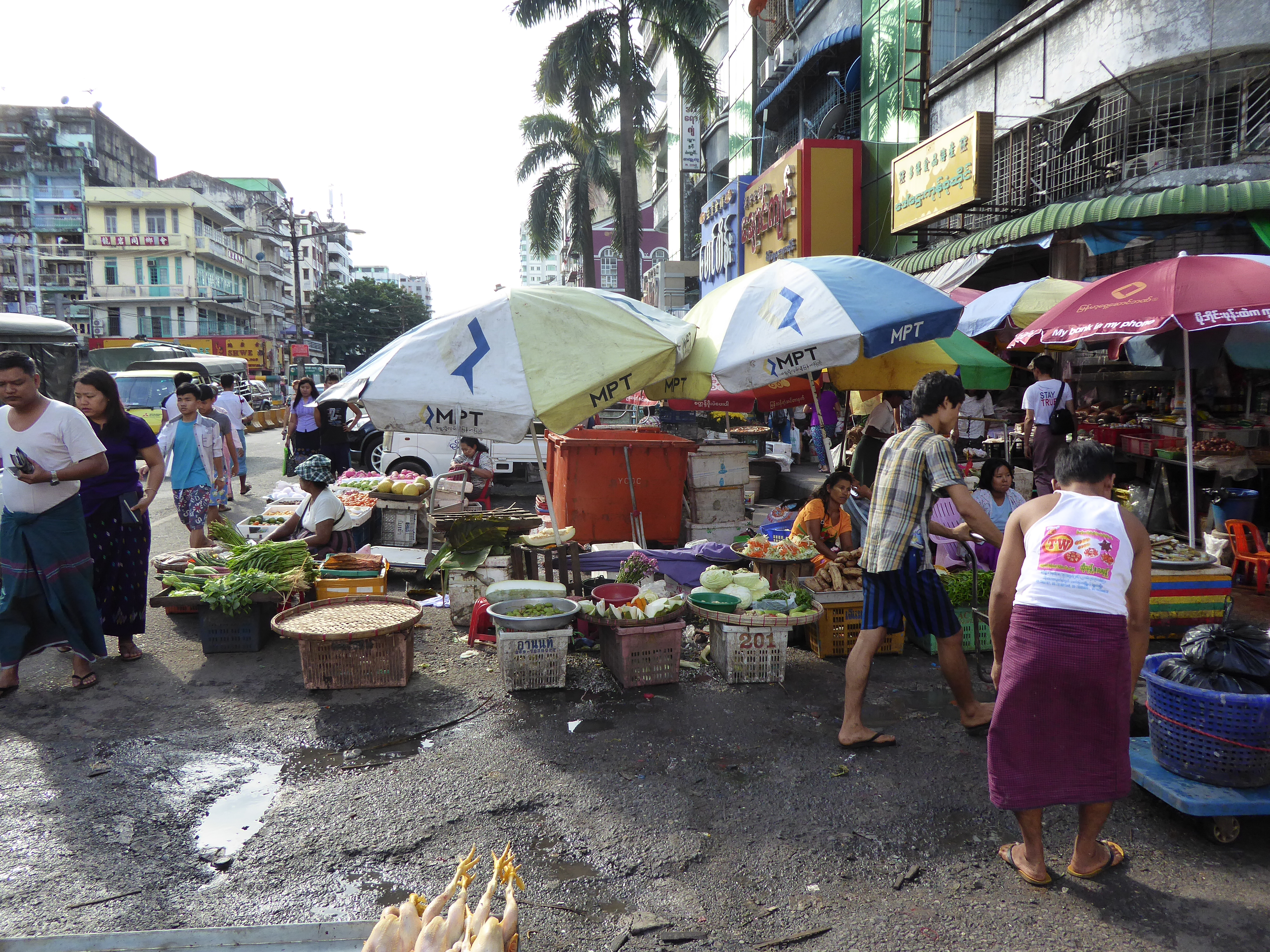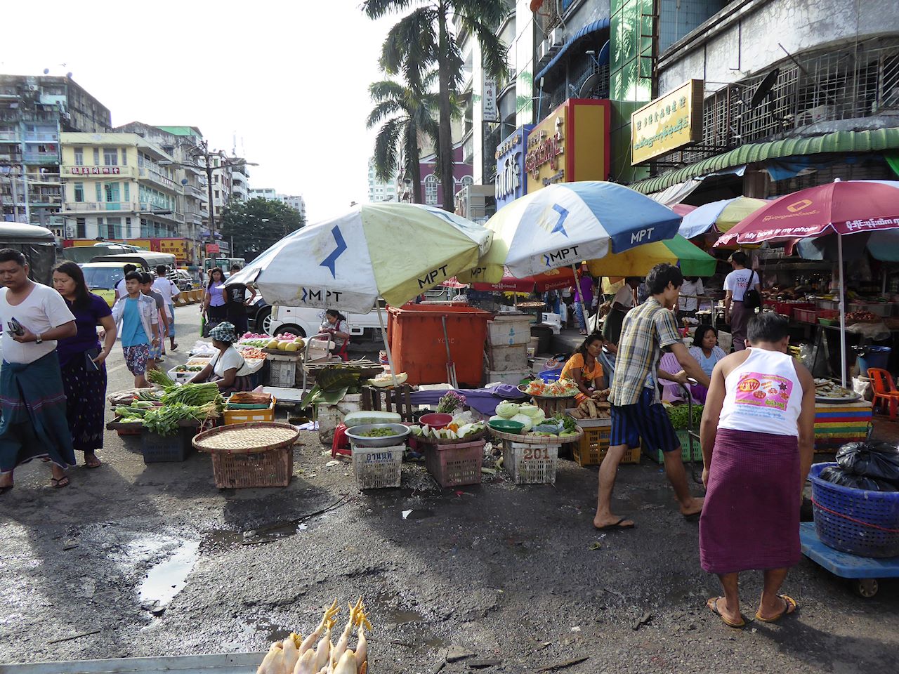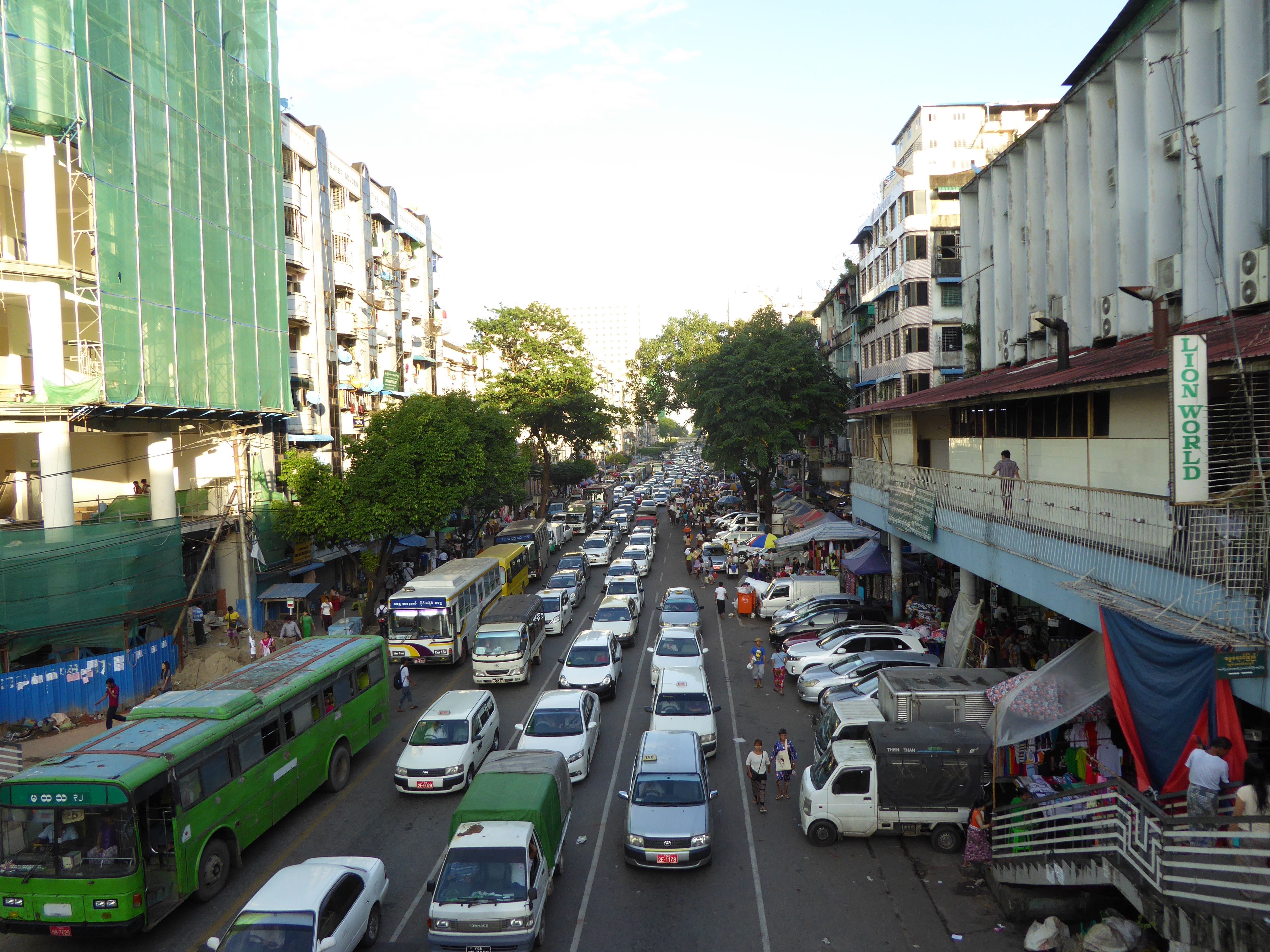 The road leading to the bridge is full of street vendors and is also very busy.