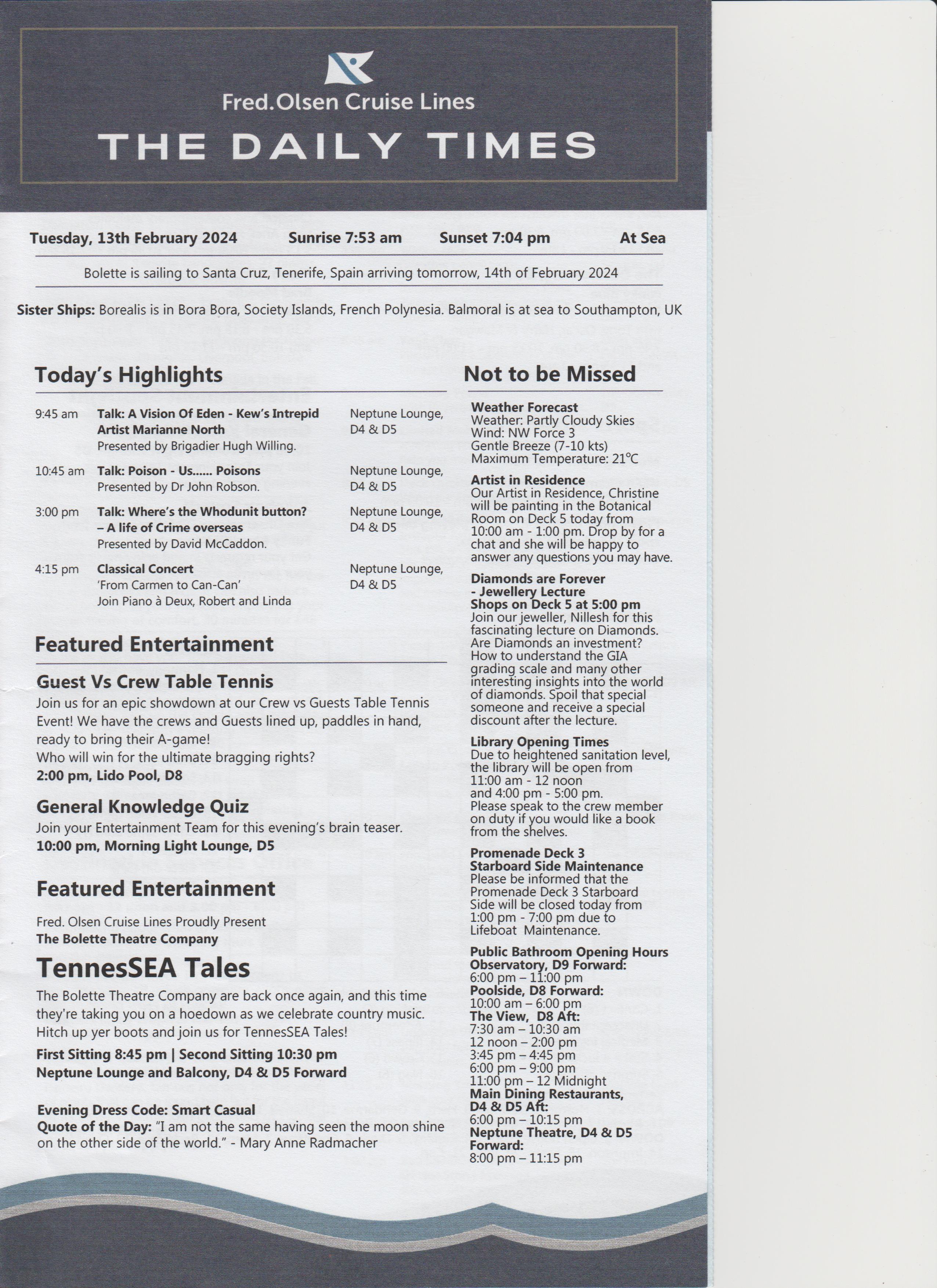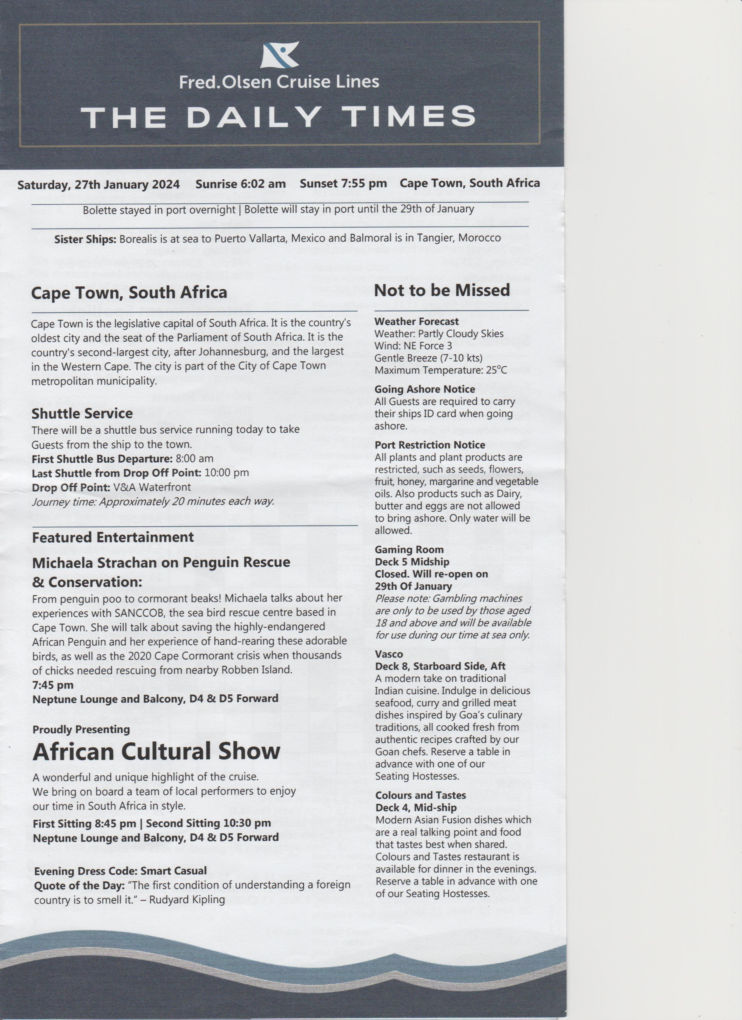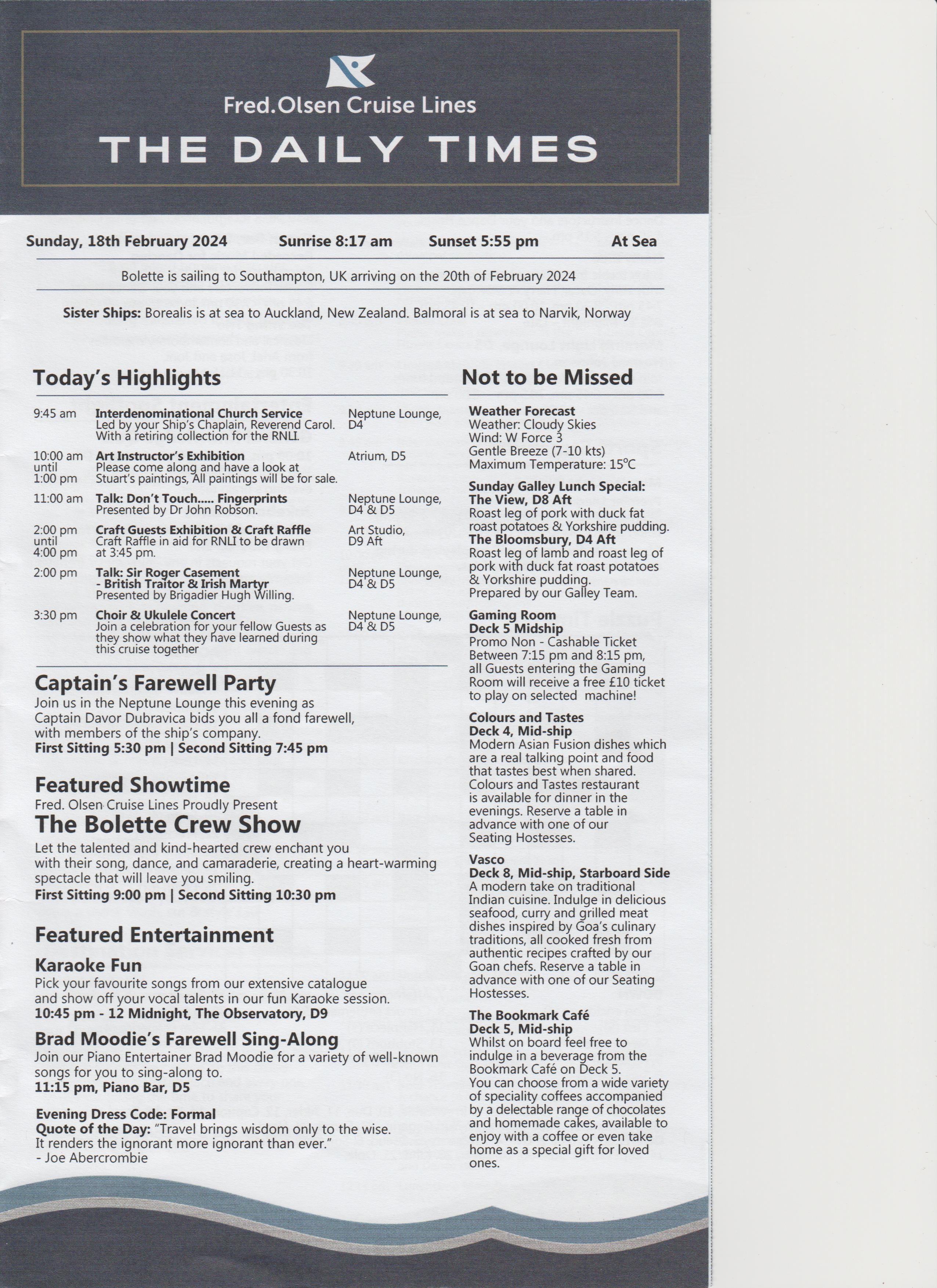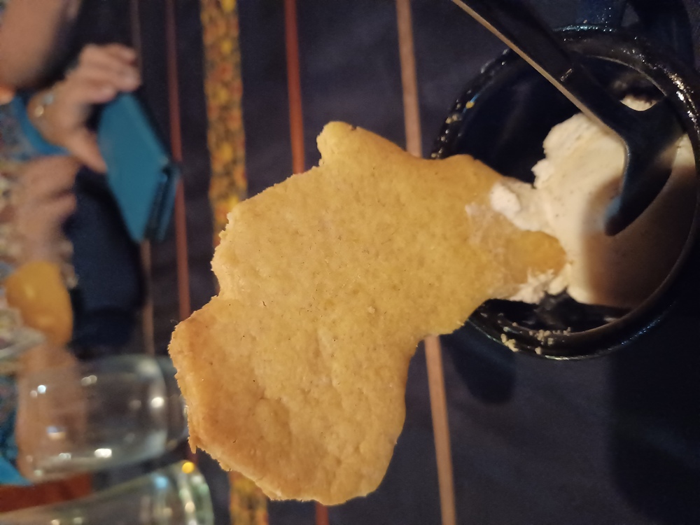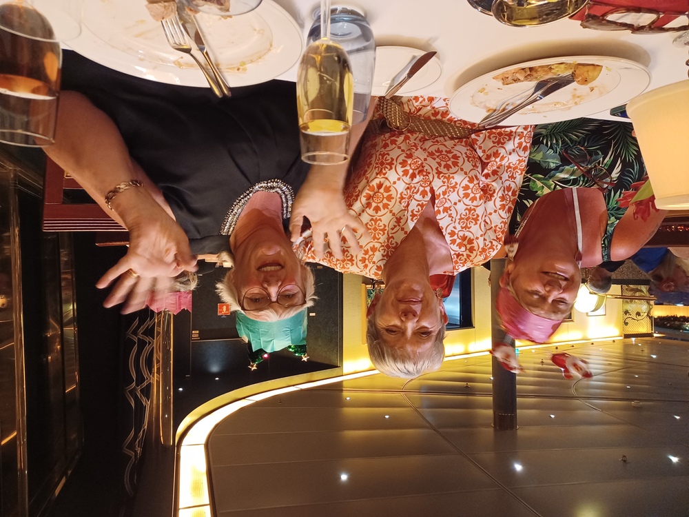 Dinner was at 18:15, table for 6, but tonight there were only 4 of us, the other couple were Keith and Alison, nice couple. Dinner was nice.