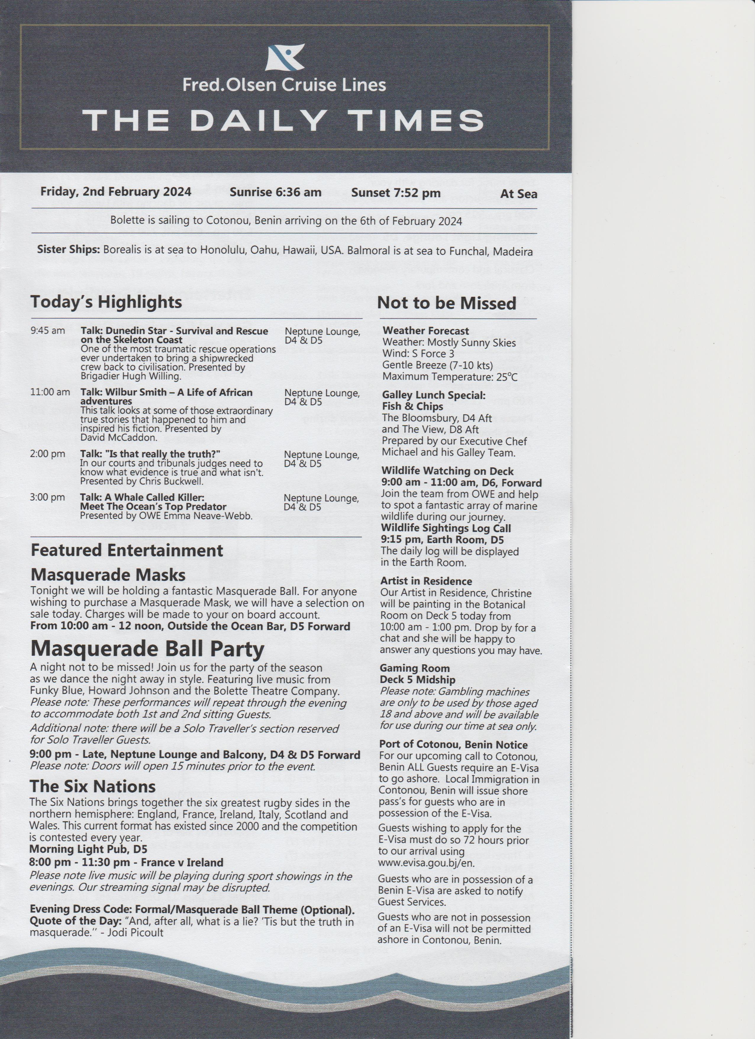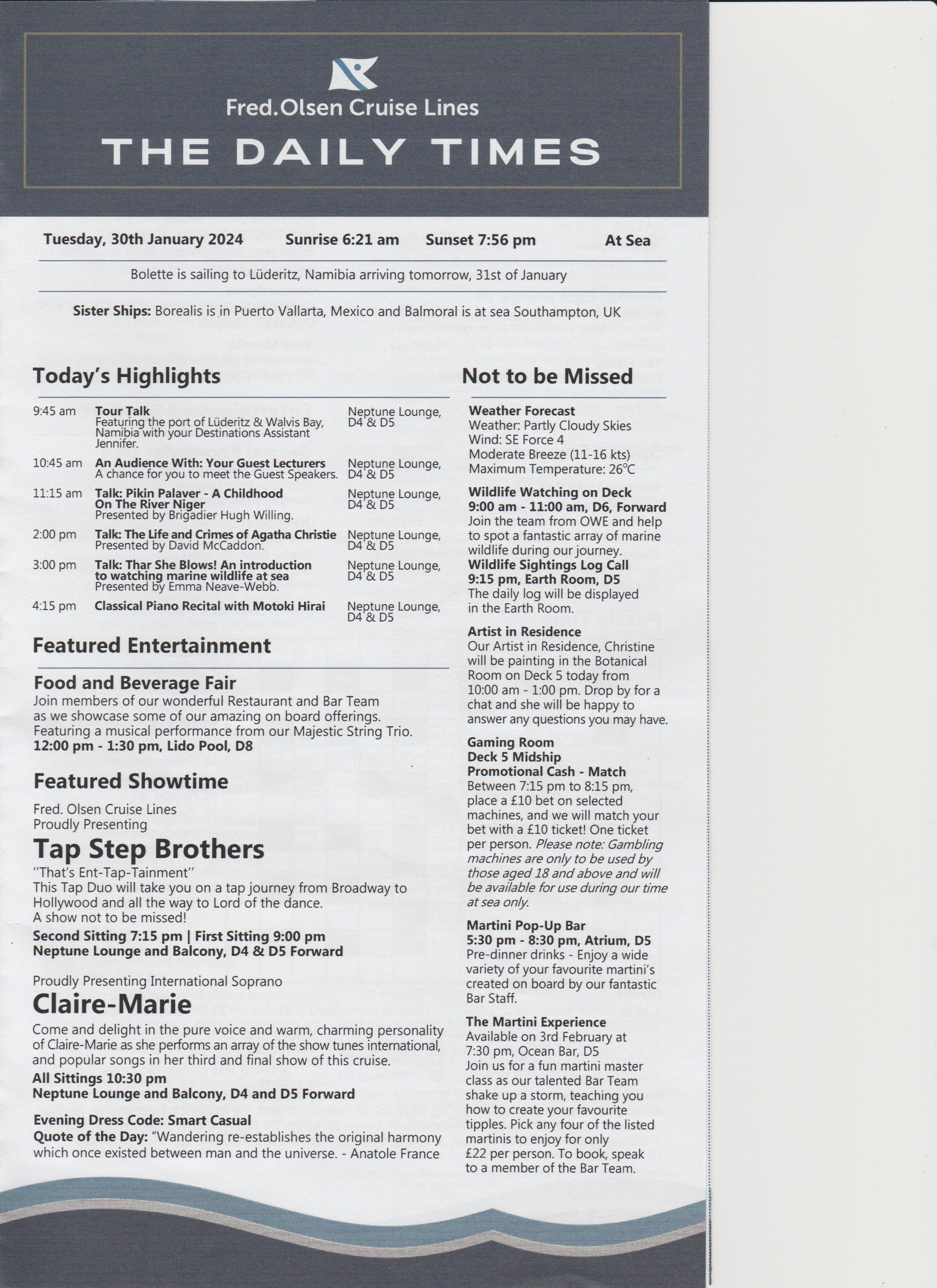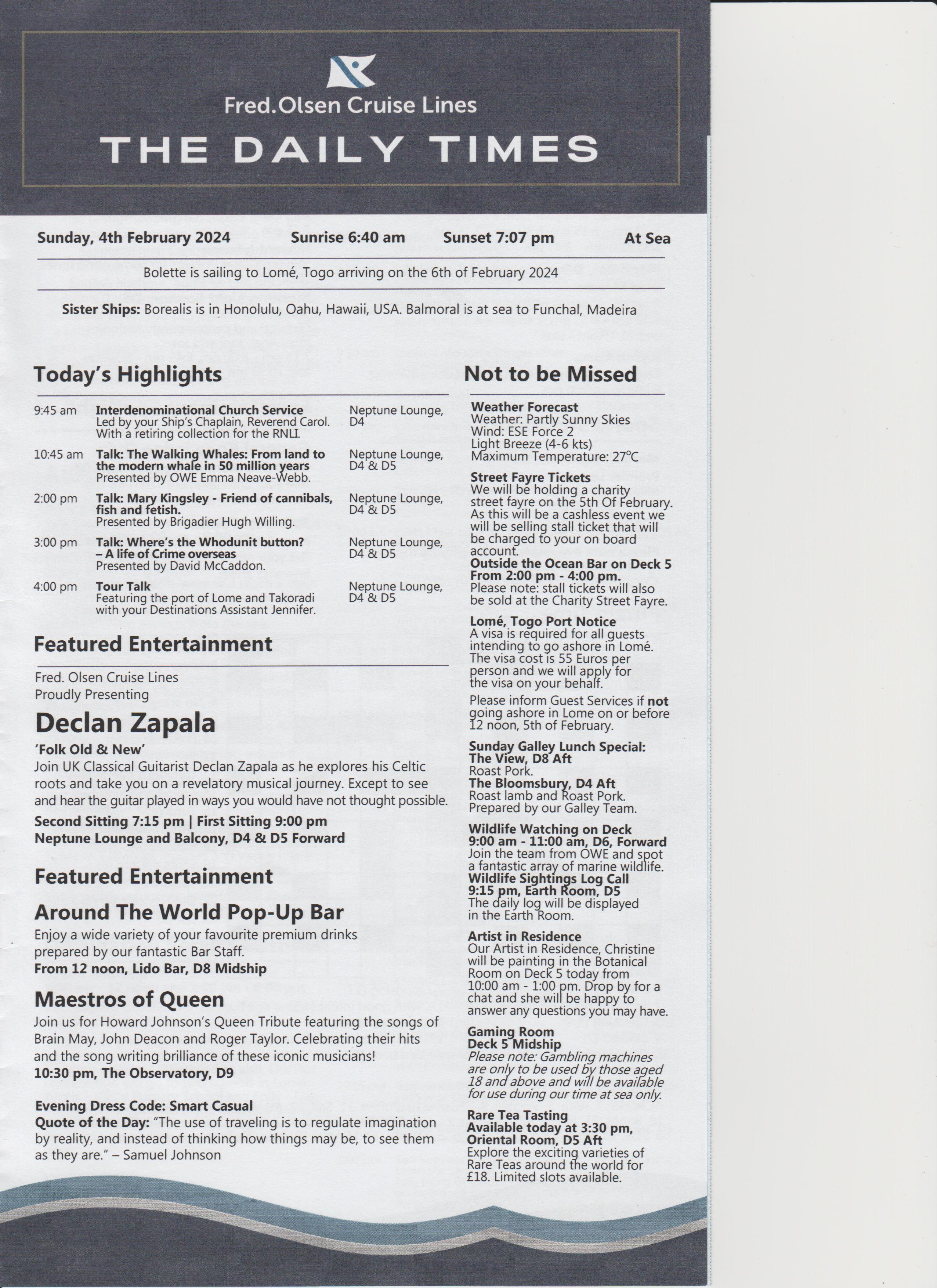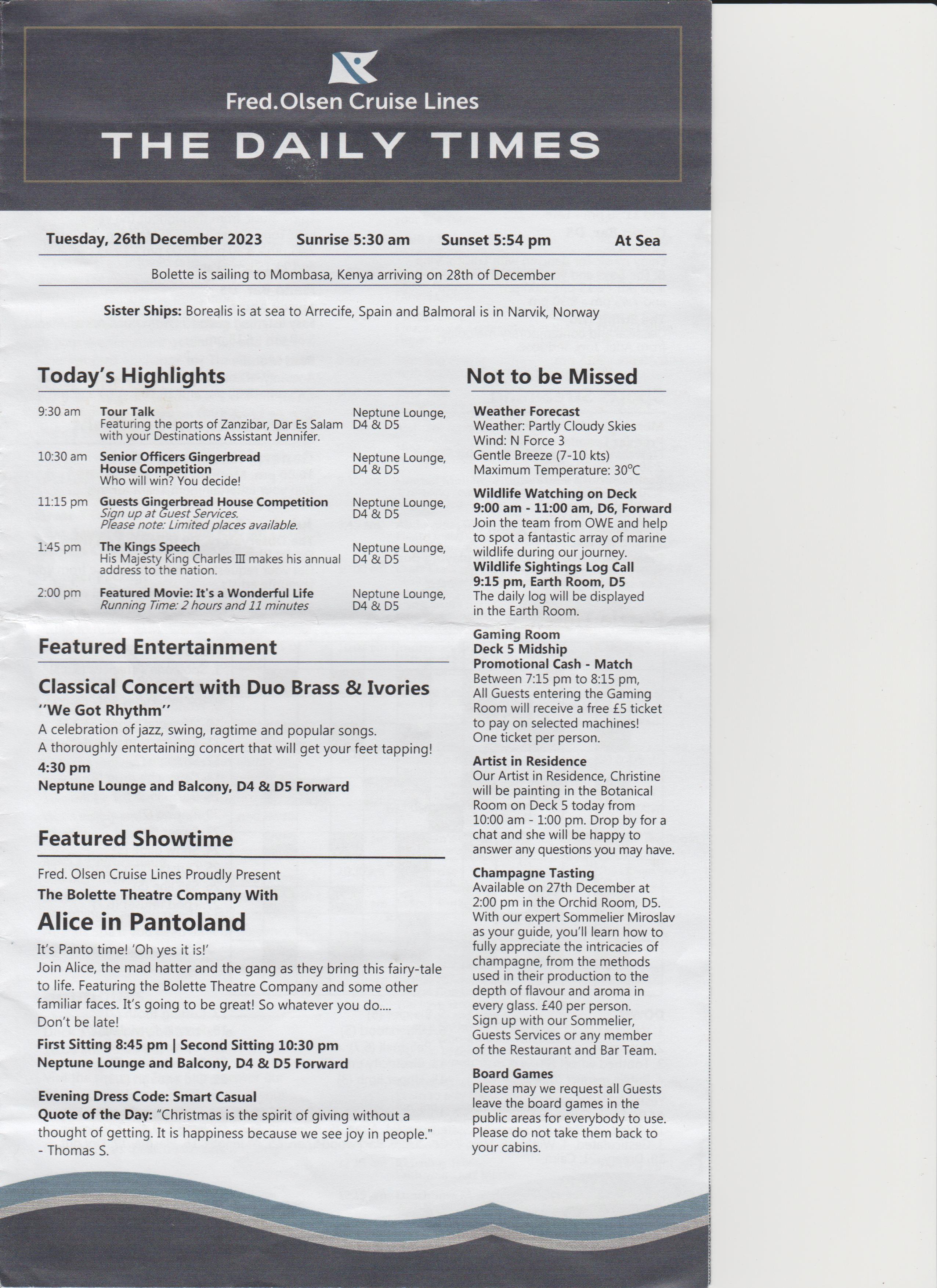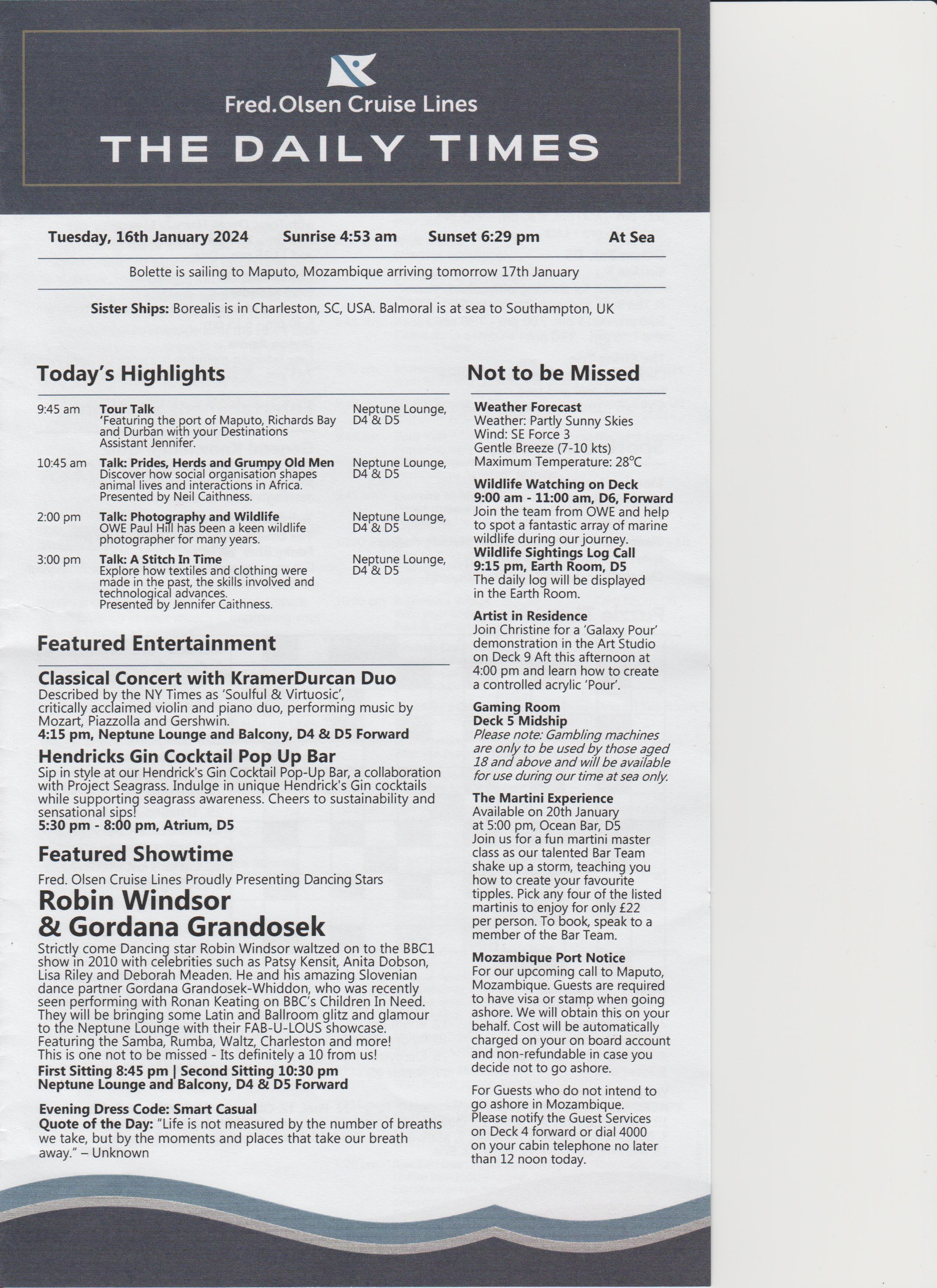Dinner was at 18:15, table for 6, but tonight there were only 4 of us, the other couple were Keith and Alison, nice couple. Dinner was nice.