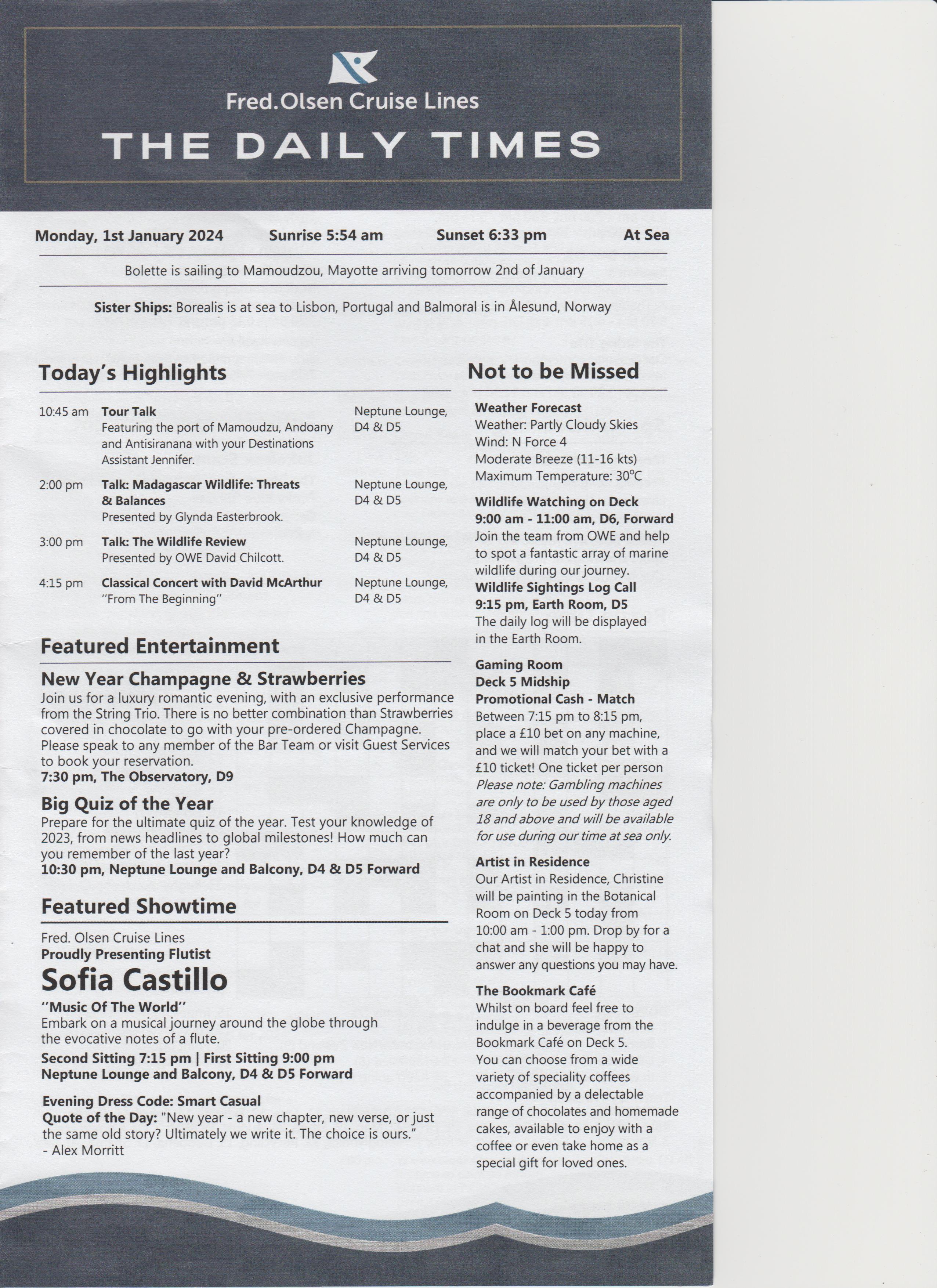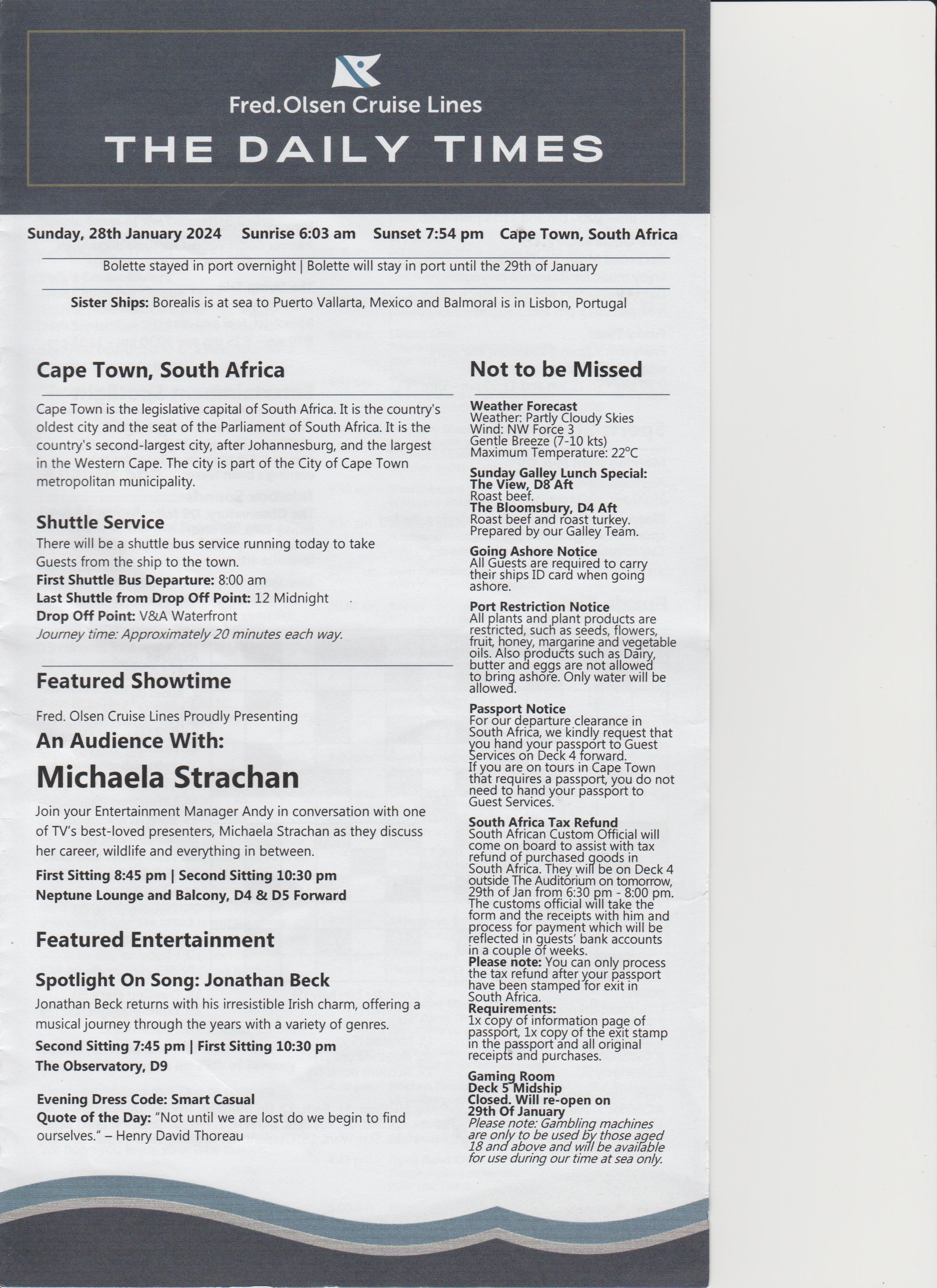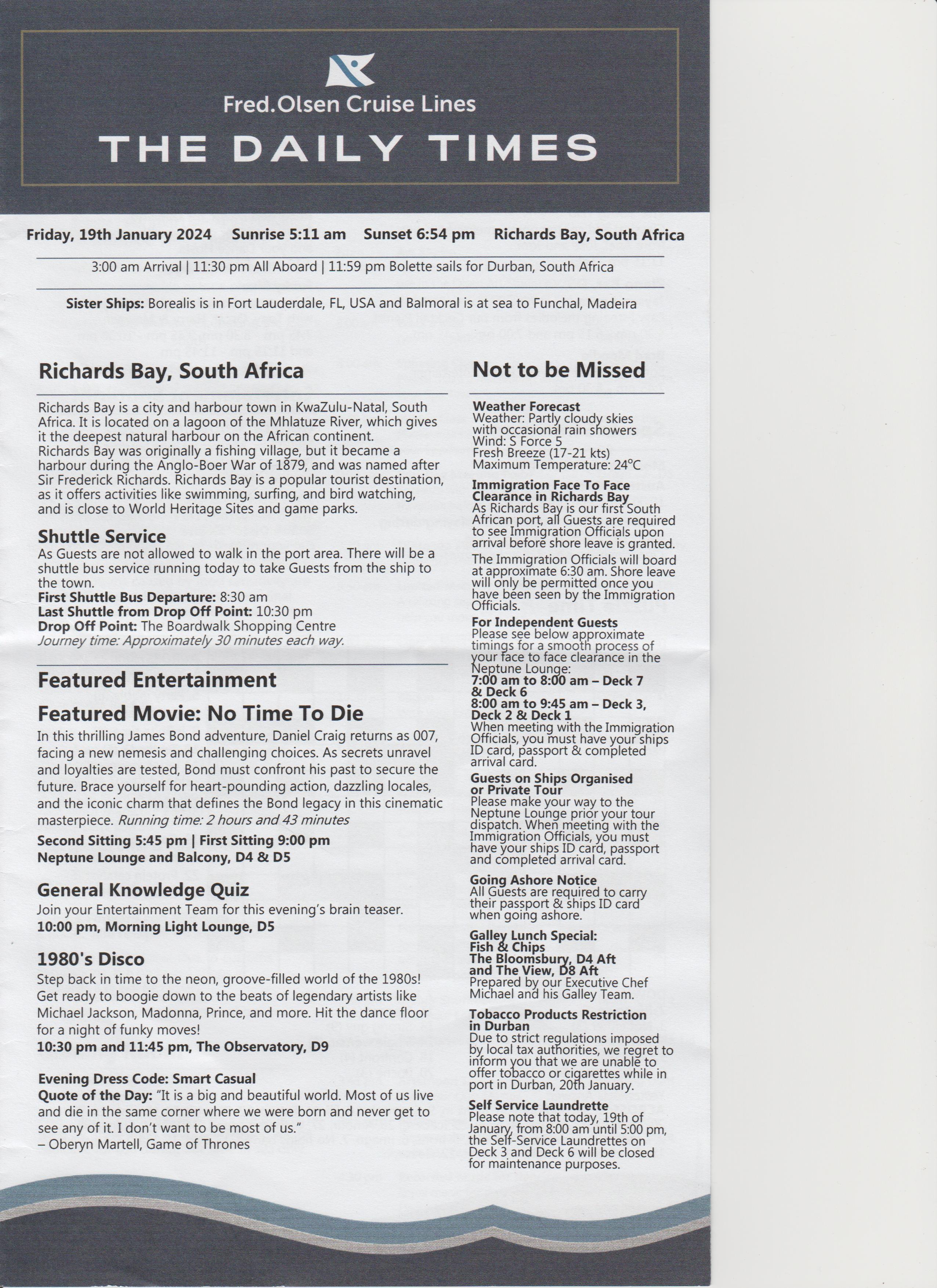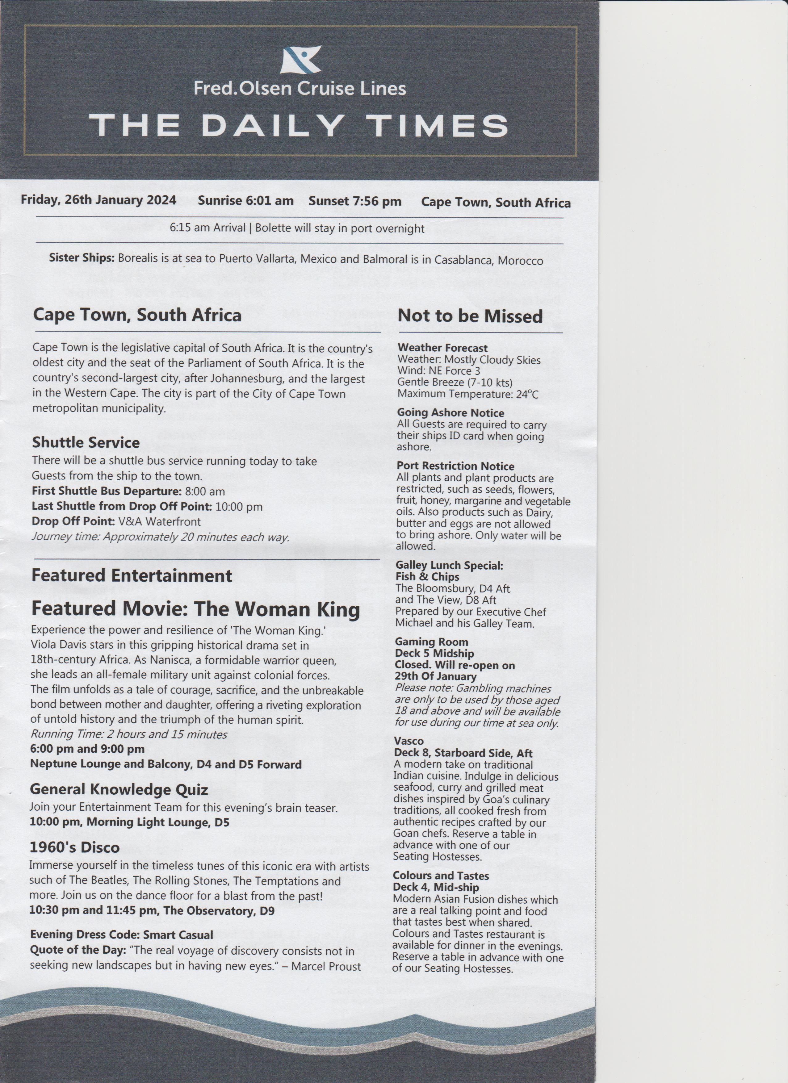 Dinner was at 18:15, table for 6, but tonight there were only 4 of us, the other couple were Keith and Alison, nice couple. Dinner was nice.