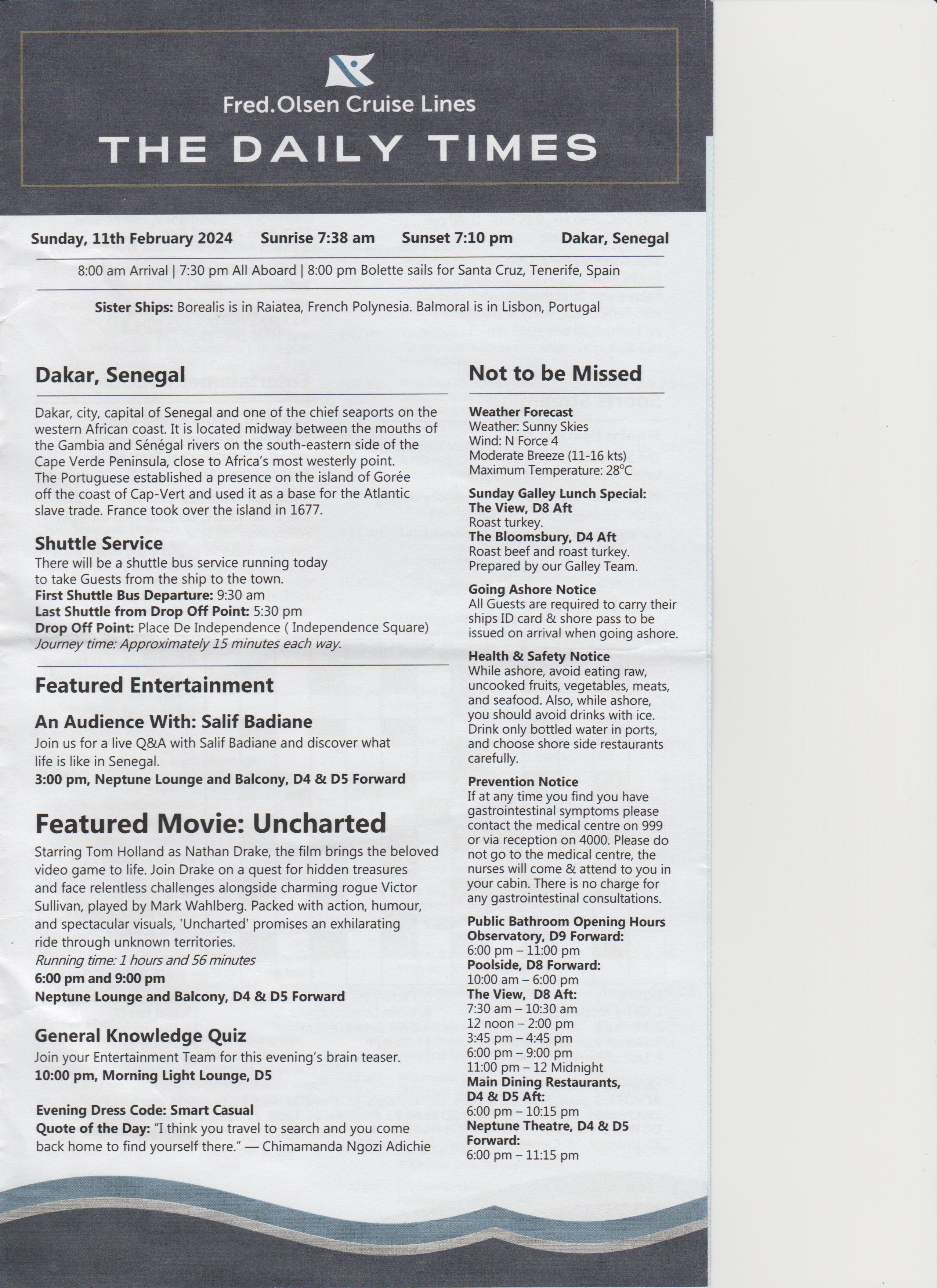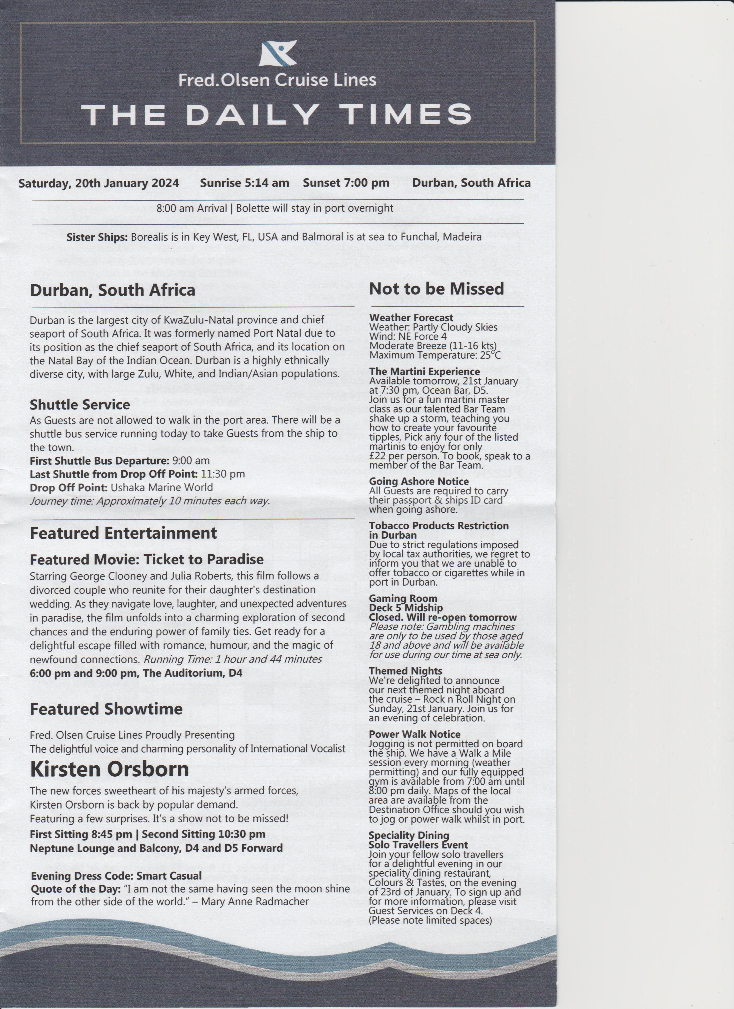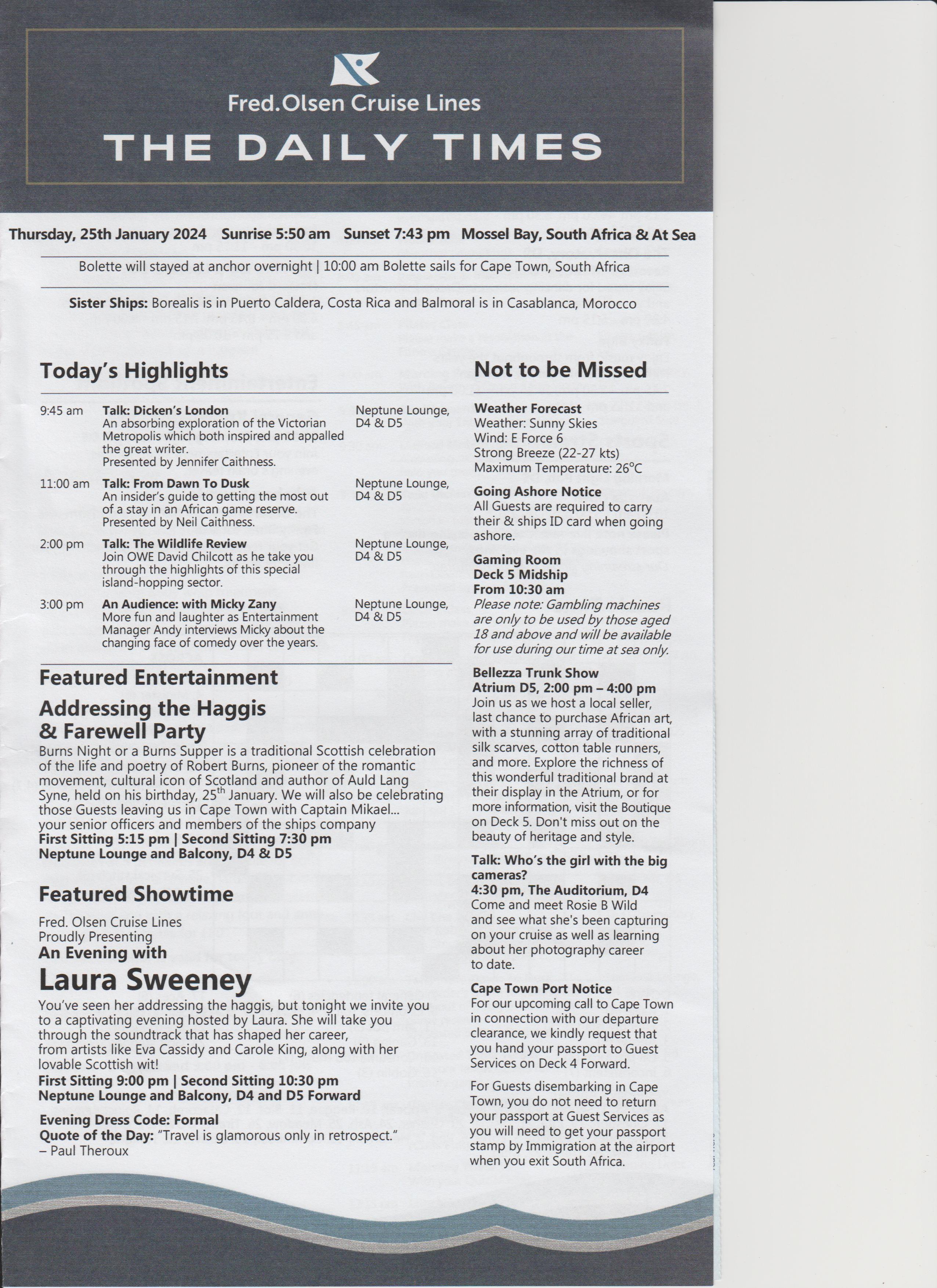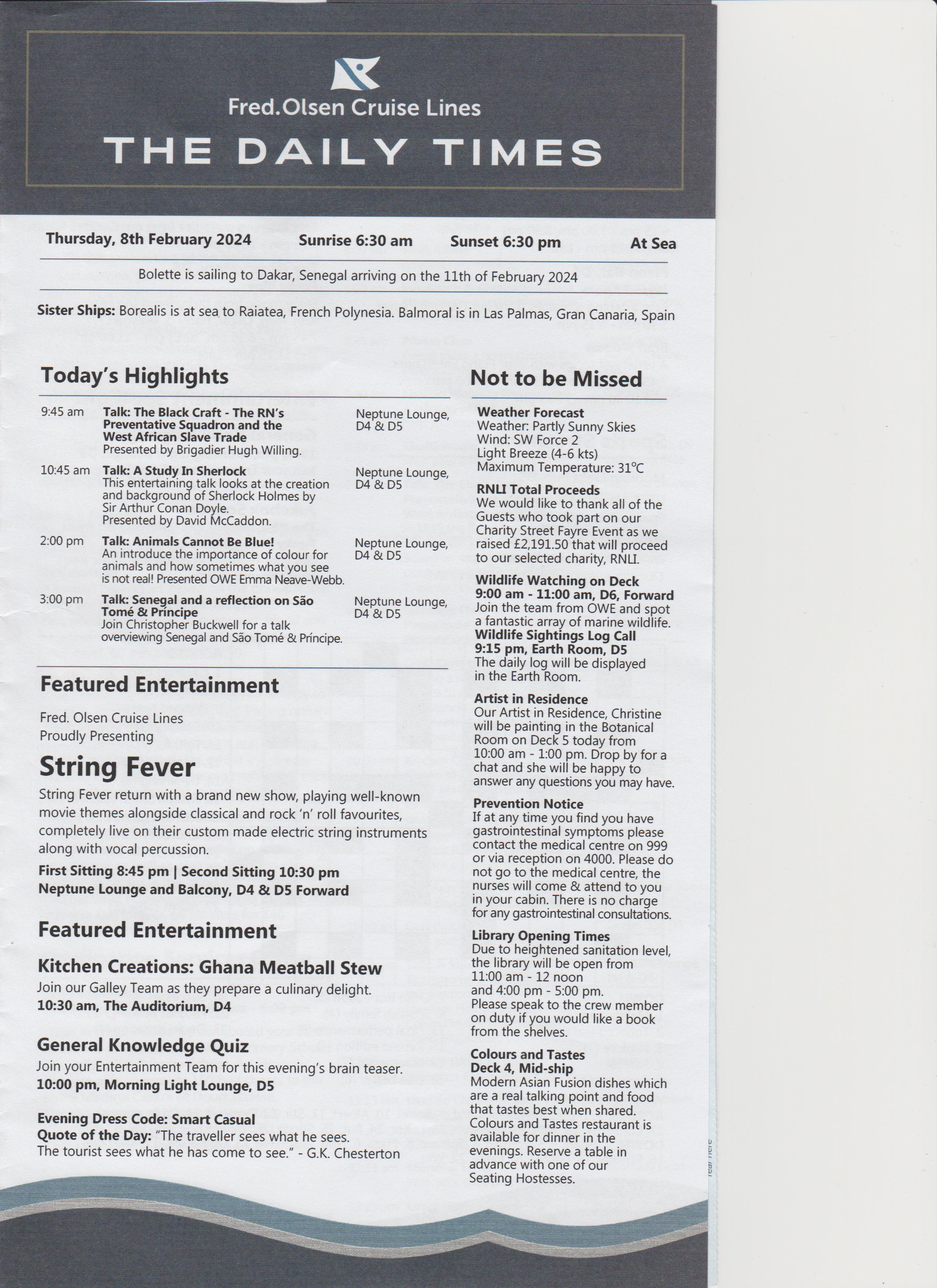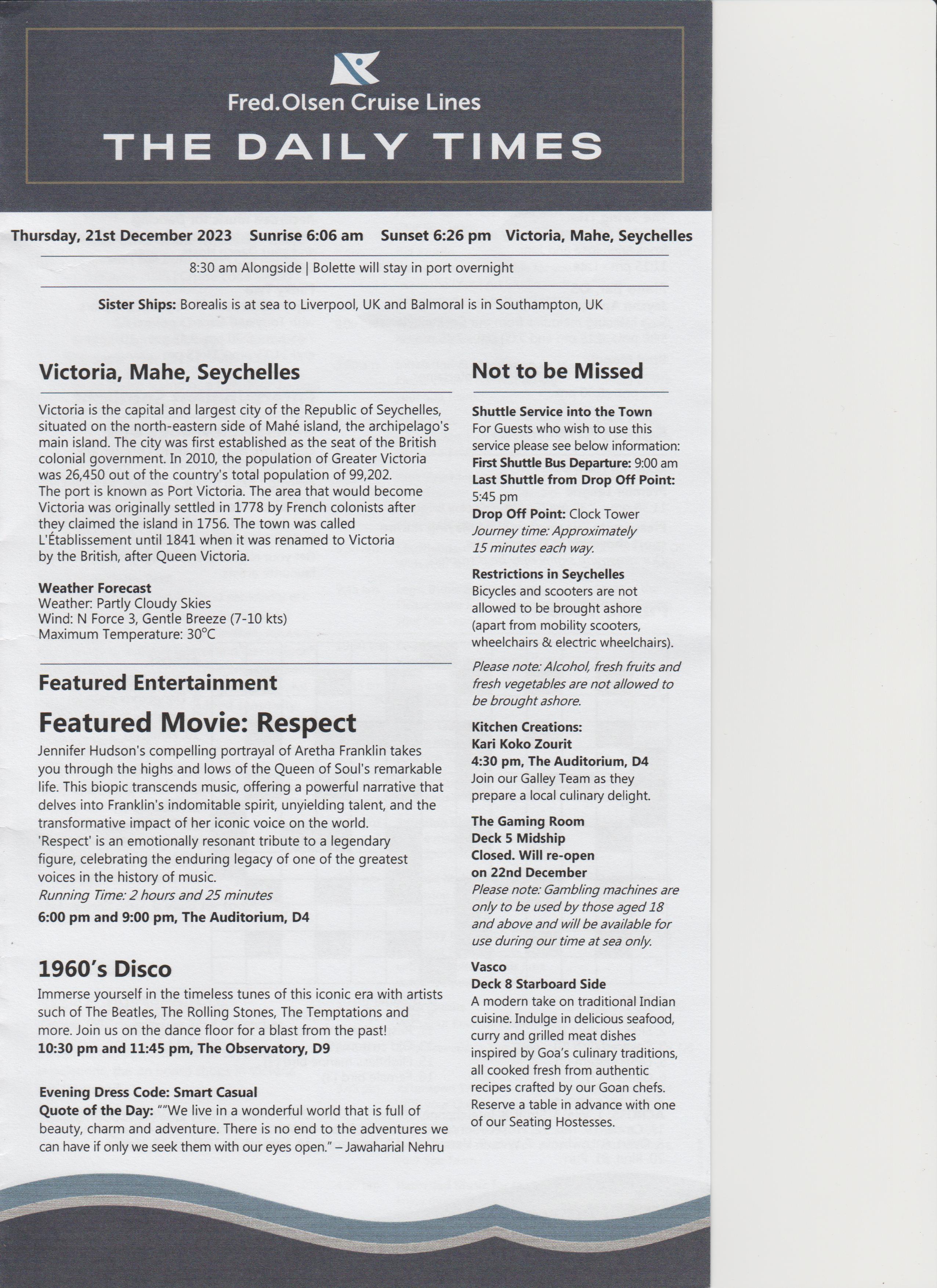 Dinner was at 18:15, table for 6, but tonight there were only 4 of us, the other couple were Keith and Alison, nice couple. Dinner was nice.